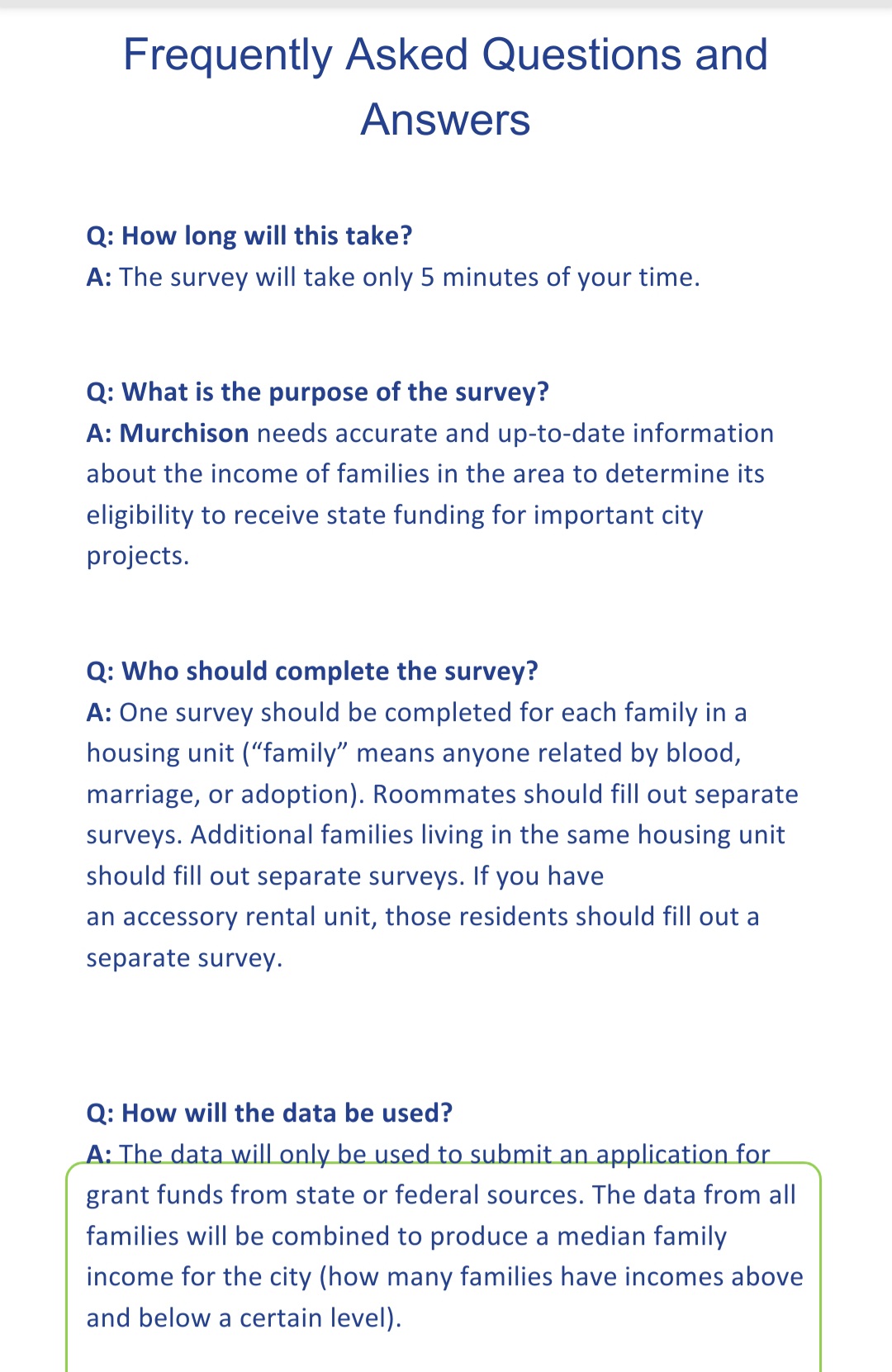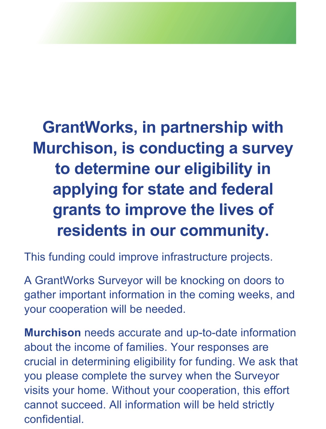Coming Soon***Grantworks will be conducting a house to house survey for City of Murchison eligibility of funds from Texas Community Development Block Grant. The 3 surveyors will be with Grantworks and will have identification. Please assist the City of Murchison in trying to obtain a grant of $750,000.00 for infrastructure improvements.